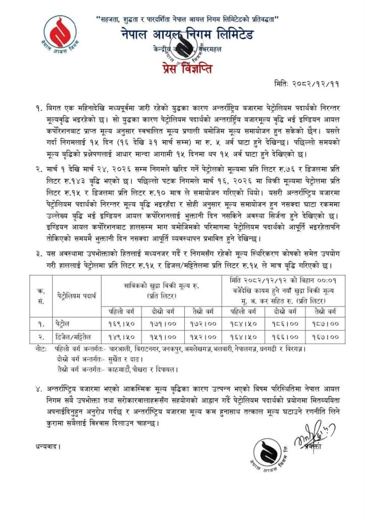 विगत एक महिनादेखि पश्चिम एसियामा जारी युद्धका कारण अन्तर्राष्ट्रिय बजारमा पेट्रोलियम पदार्थको निरन्तर मूल्यवृद्धि भइरहेको जारी विज्ञप्तिमा उल्लेख रिएकाे छ ।