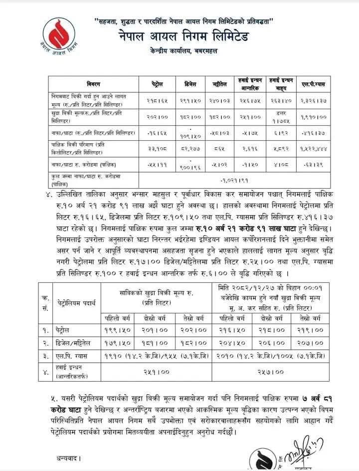 झापा । नेपाल आयल निगमले पेट्रोलियम पदार्थको मूल्य बढाएको छ । निगमले बिहीबार राति १२ बजेपछि लागू हुने गरी पेट्रोलियम पदार्थको मूल्य बढाएको हो ।