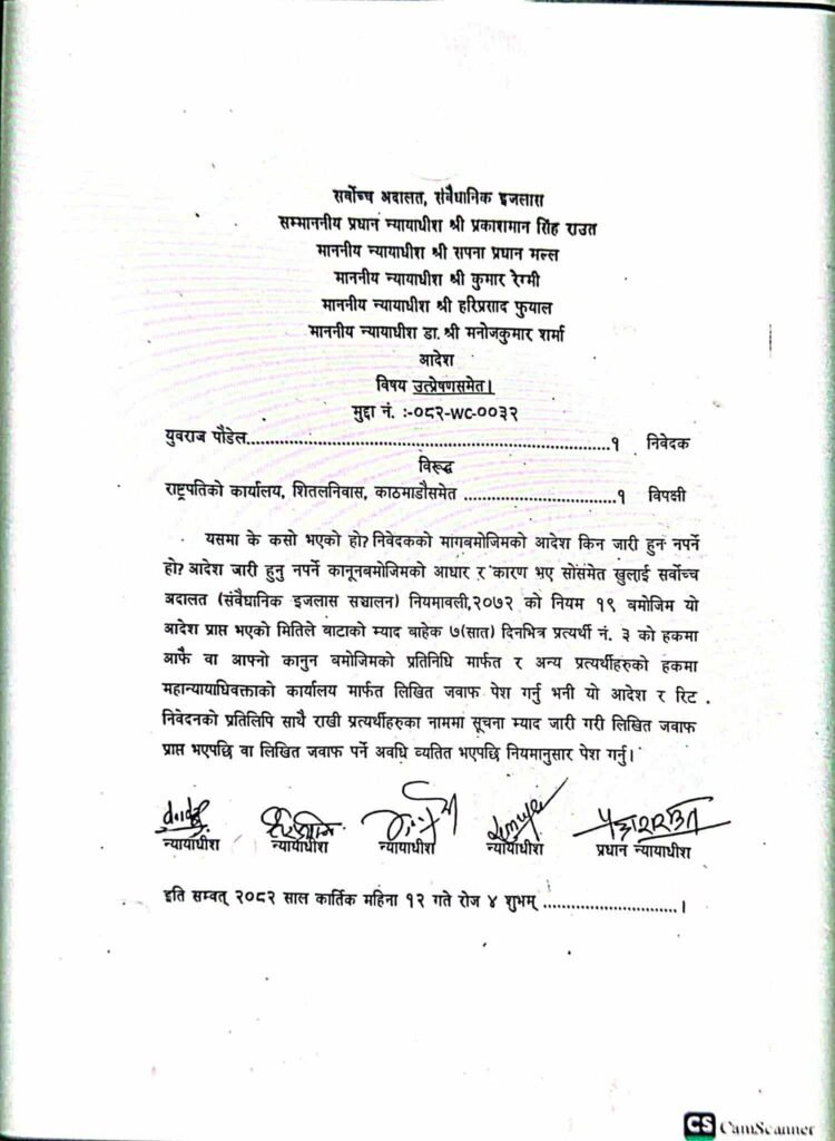 इजलासले विपक्षी राष्ट्रपति कार्यालय, प्रधानमन्त्री तथा मन्त्रिपरिषद्को कार्यालयलगायतलाई ७ दिनभित्र लिखित जवाफ पेस गर्न आदेश दिएको छ।