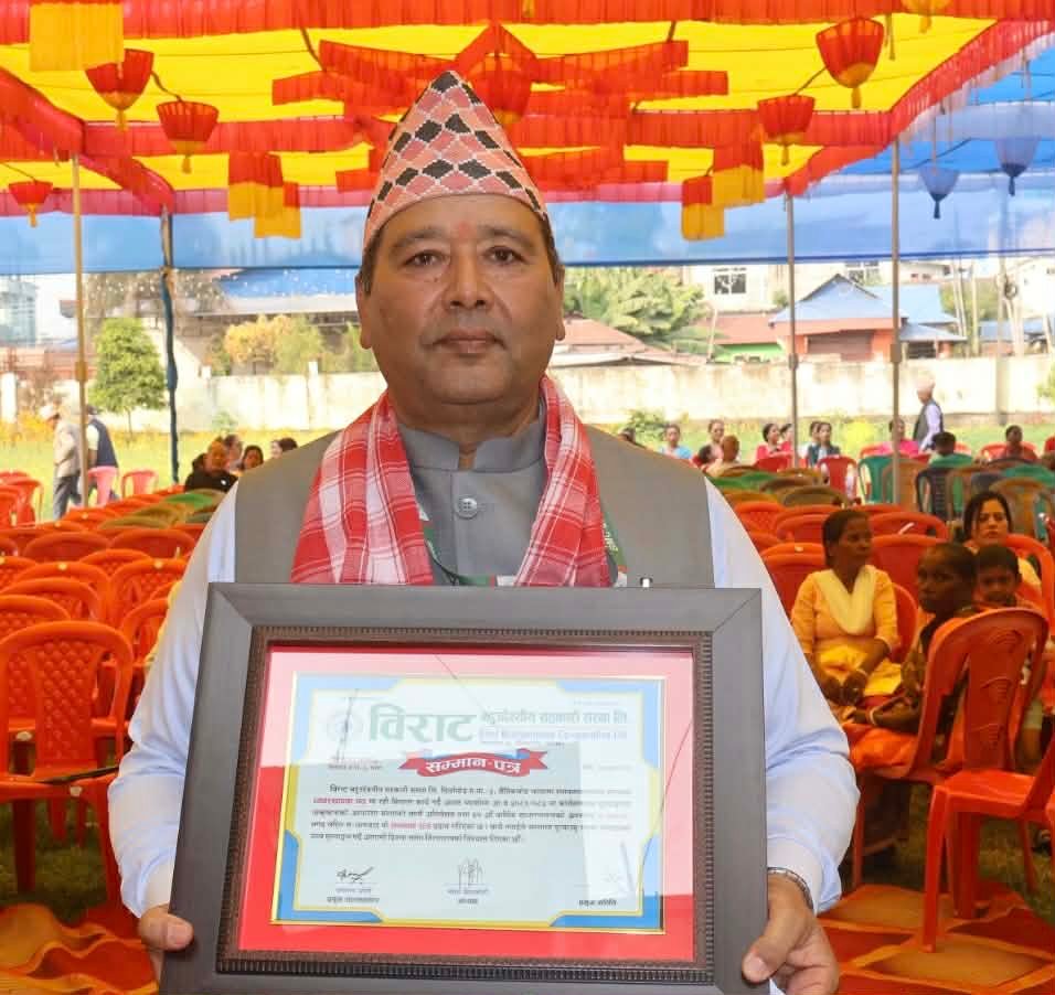 बिर्तामोड, झापा बिराट बहुउद्देश्यीय सहकारी संस्था लिमिटेडले आफ्नो २०औँ वार्षिक साधारण सभा र ७औँ अधिवेशनको अवसरमा यस वर्षको ‘उत्कृष्ट कर्मचारी सम्मान’ संस्थाका ब्यवस्थापक तेज प्रसाद पाठकलाई प्रदान गरेको छ।