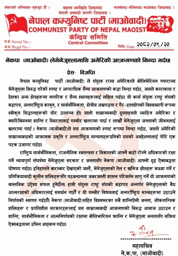 पार्टी केन्द्रीय महासचिव गौरबद्वारा जारी प्रेस विज्ञप्तिमा अमेरिकाले बोलिभेरियन गणराज्य भेनेजुएलाविरुद्ध गरेको स्पष्ट र आपराधिक सैन्य आक्रमण अन्तर्राष्ट्रिय कानुन, संयुक्त राष्ट्रसंघको बडापत्र तथा सार्वभौमिकता, क्षेत्रीय अखण्डता र गैर–हस्तक्षेपसम्बन्धी विश्वव्यापी मान्यताहरूको घोर उल्लङ्घन भएको उल्लेख गरिएको छ।