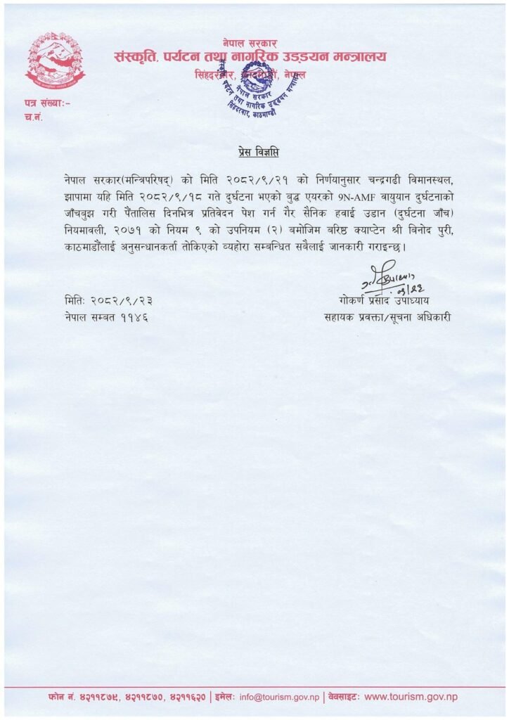 संस्कृति, पर्यटन तथा नागरिक उड्डयन मन्त्रालयका सूचना अधिकारी गोकर्णप्रसाद उपाध्यायका अनुसार सोमबार बसेको मन्त्रिपरिषद् बैठकको निर्णयअनुसार समिट एयरमा कार्यरत वरिष्ठ क्याप्टेन विनोद पुरीलाई अनुसन्धानकर्ताका रूपमा नियुक्त गर्दै मन्त्रालयस्तरीय छानबिन समिति गठन गरेको हो। गैरसैनिक हवाई उडान नियमावली, २०७१ अनुसार क्याप्टेन पुरीले आवश्यकताअनुसार विषयगत विज्ञहरू समेटी दुर्घटनाको अनुसन्धान गर्ने छन l